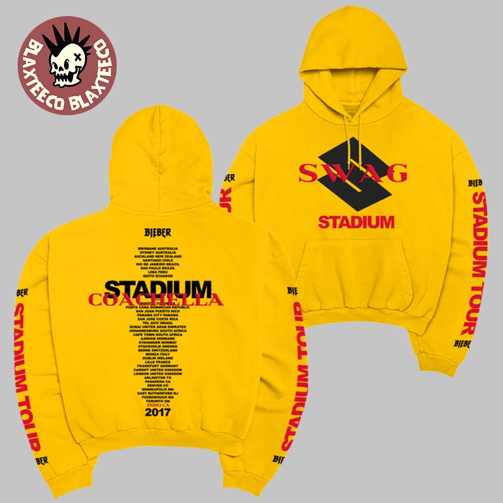 Bright, bold, and impossible to miss—the Justin Bieber Coachella 2026 Weekend 2 Merch Stadium Tour X Swag SKYLRK Yellow Hoodie is a standout piece that brings serious festival energy to your wardrobe. The vibrant yellow color instantly grabs attention, while the front design features a clean geometric graphic with “SWAG” and “STADIUM” branding in striking red and black, giving it that signature Bieber streetwear aesthetic.