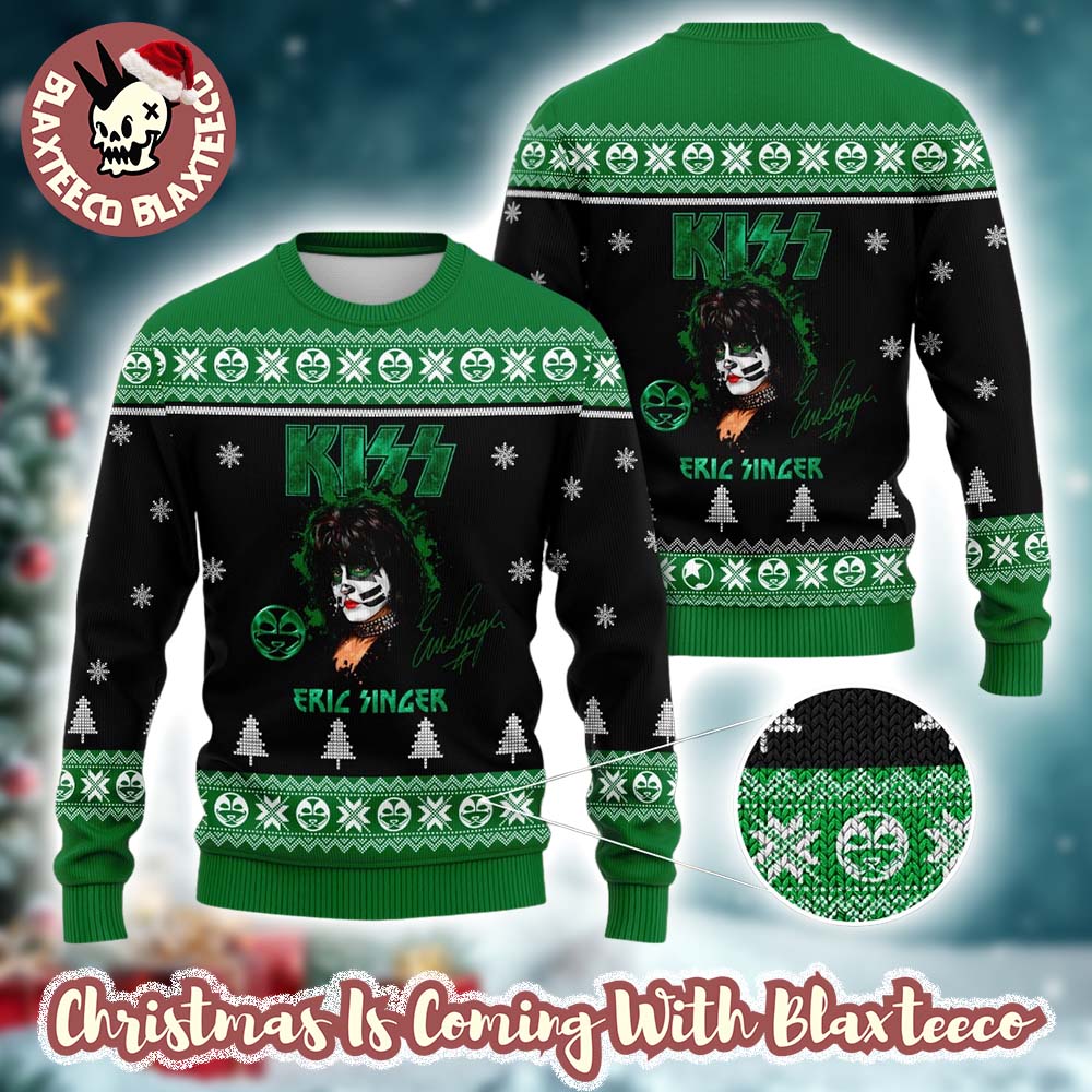 Blaxteeco: About Kiss Band Eric Singer Signature Gift For Fans Green Knitted Ugly Christmas Sweater: