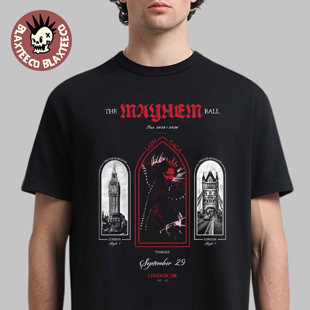Lady Gaga The Mayhem Ball Tour 2025 2026 London UK Night 1 T-Shirt Features: