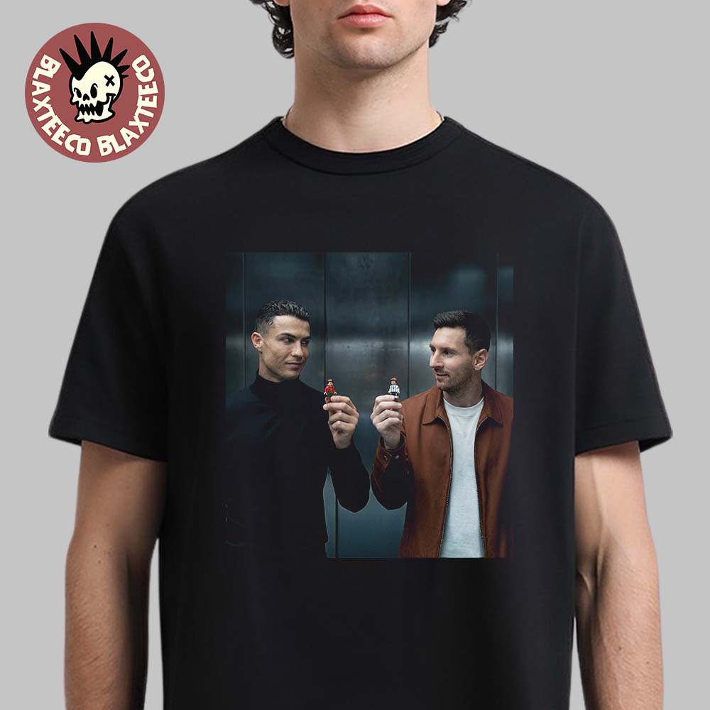 Celebrate football greatness with the Lego X World Cup 2026 Cristiano Ronaldo X Lionel Messi Commercial Photo GOAT T-Shirt, a must-have for fans of the beautiful game. This stylish black tee features a striking graphic of two legendary players facing off while holding miniature Lego-style figures, symbolizing their iconic rivalry and global influence. The modern, cinematic design captures the essence of the “GOAT” debate, making this shirt a bold statement piece for anyone who admires the legacy of these two football superstars.