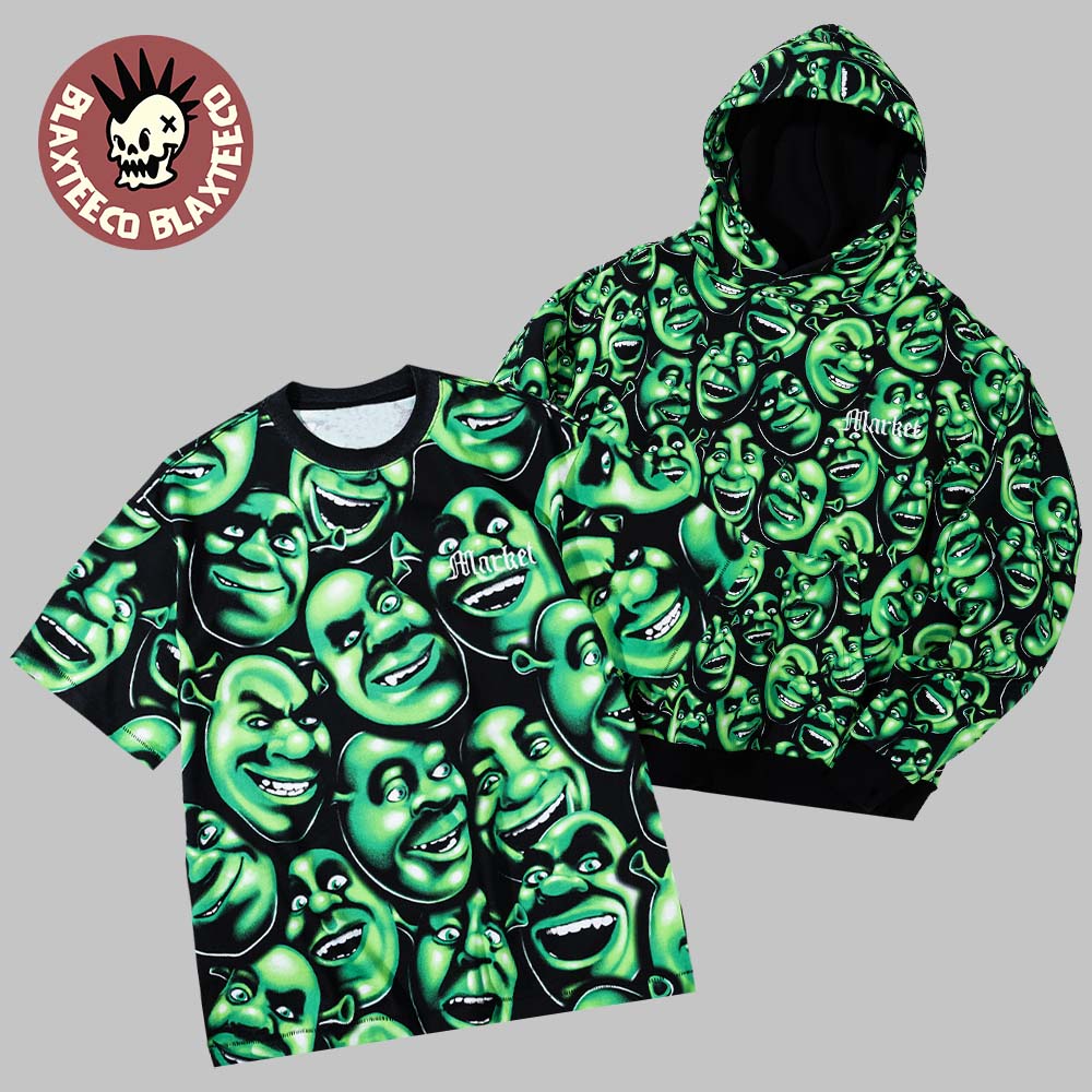 Make a bold statement with the Market X Shrek Iconic Liquid Blue Skull Inspired All Over Print T-Shirt Hoodie, a unique piece that blends streetwear creativity with nostalgic pop culture energy. This eye-catching design features a striking all-over pattern of Shrek-inspired faces in vibrant green tones, creating a playful yet edgy aesthetic that instantly stands out. The chaotic collage style combined with bold graphics captures the spirit of classic Liquid Blue-inspired art while giving it a modern streetwear twist. Whether you’re a fan of iconic animated characters, bold graphic fashion, or statement pieces that turn heads, this design delivers a fun and unforgettable look that celebrates creativity and individuality.