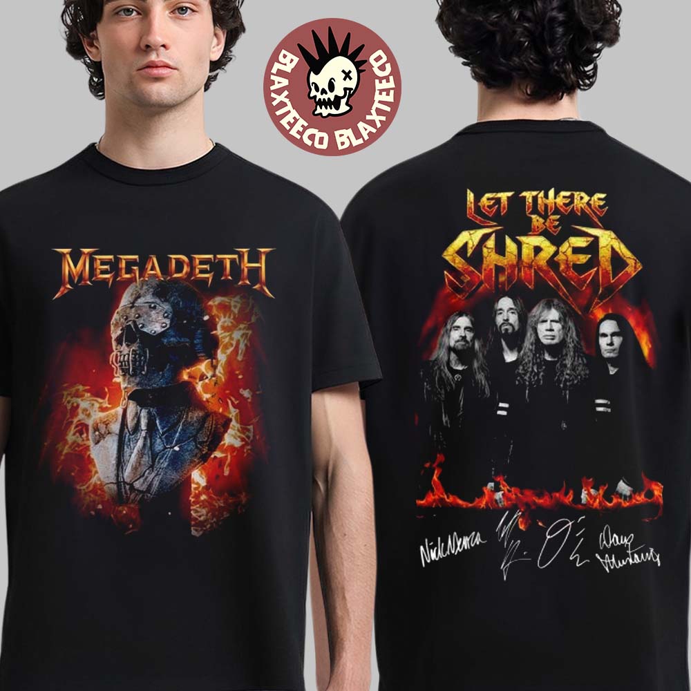Megadeth Let There Be Shred Band Potrait With Signatures T-Shirt is a powerful tribute to one of the most influential bands in heavy metal history. This striking two-sided design features the iconic skull artwork and blazing Megadeth logo on the front, capturing the band’s aggressive thrash metal identity. The back showcases a bold band portrait under the legendary Let There Be Shred title, complete with printed signature-style graphics that add a collectible, tour-merch feel. The fiery color palette and dramatic composition perfectly reflect the intensity, speed, and attitude that define Megadeth.