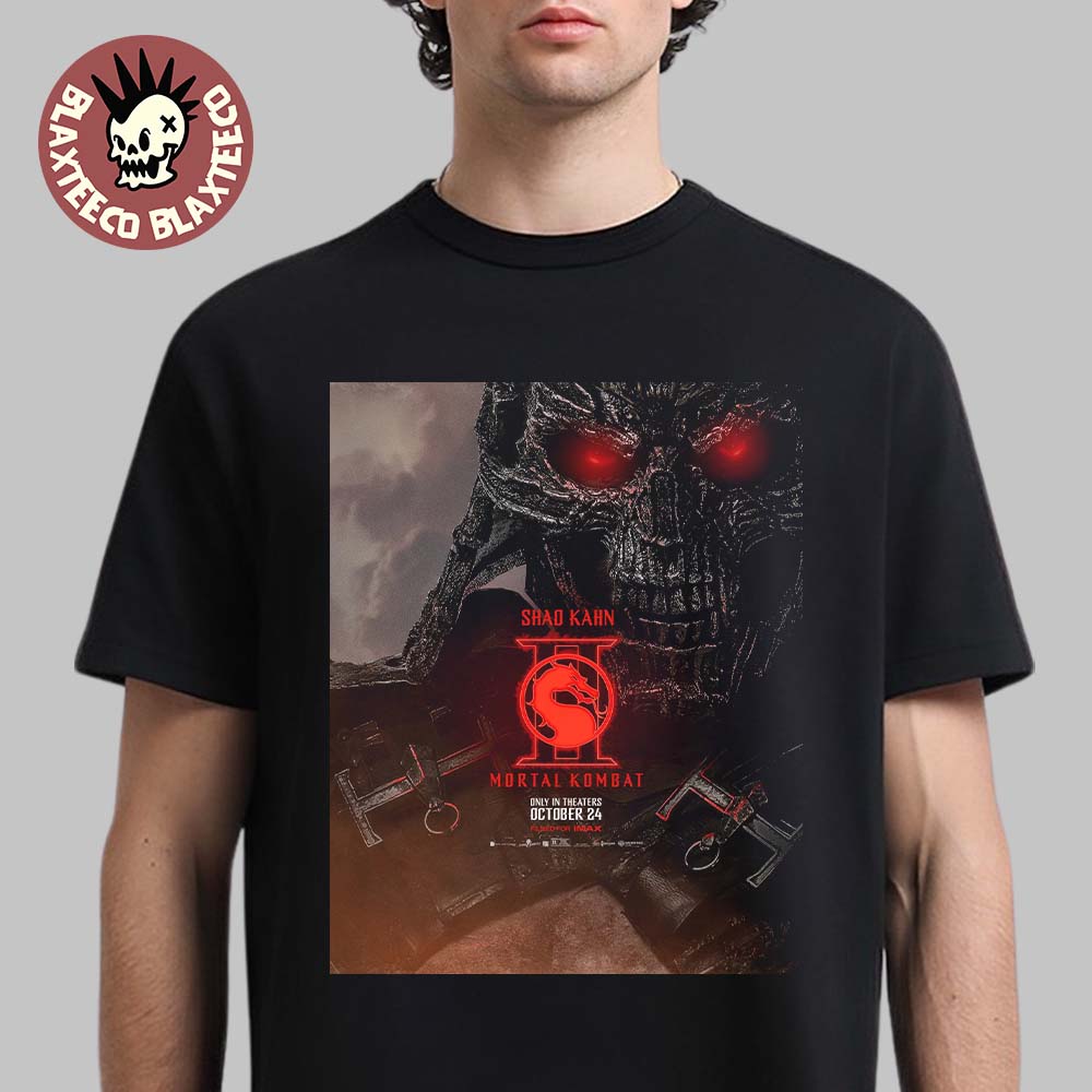 The Mortal Kombat II Movie Exclusive Shao Kahn Character Poster T-Shirt delivers an intense and commanding design inspired by one of the most iconic villains in the Mortal Kombat universe. Featuring a menacing close-up of Shao Kahn with glowing red eyes and a terrifying skull-like mask, this artwork captures his brutal power and dominance. The bold red Mortal Kombat II emblem at the center enhances the dark, cinematic tone, creating a visually striking contrast against the shadowy background. This exclusive movie-inspired design embodies the fear and authority of Shao Kahn, making it a must-have for fans who appreciate powerful antagonists and epic storytelling.