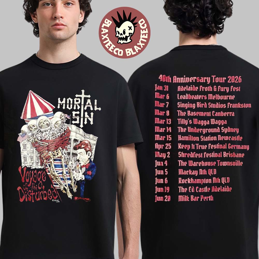 Blaxteeco: About Mortal Sin 48th Anniversary Tour 2026 Australia Merch Voyage Of The Disturbed T-Shirt: