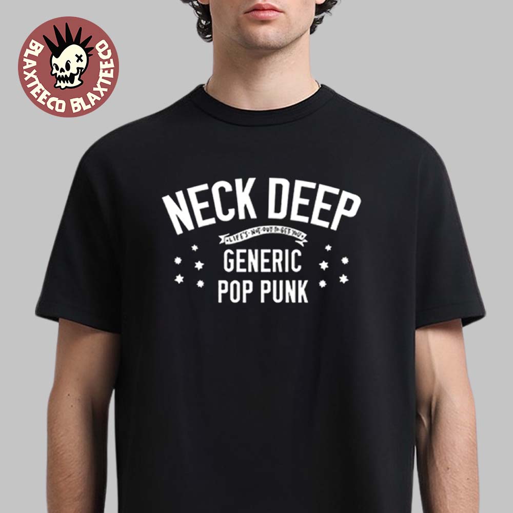 Neck Deep LNOTGY 10 Year Merch Collection Generic Pop Punk Logo T-Shirt is a clean, tongue-in-cheek tribute to the band’s iconic album Life’s Not Out To Get You. Featuring bold varsity-style typography with the phrase “Generic Pop Punk”, this design embraces Neck Deep’s self-aware humor while celebrating a decade of influence on the modern pop-punk scene. The minimalist black-and-white layout keeps the look timeless and easy to wear, while subtle star accents and the LNOTGY reference add depth for fans who know the album’s legacy.
