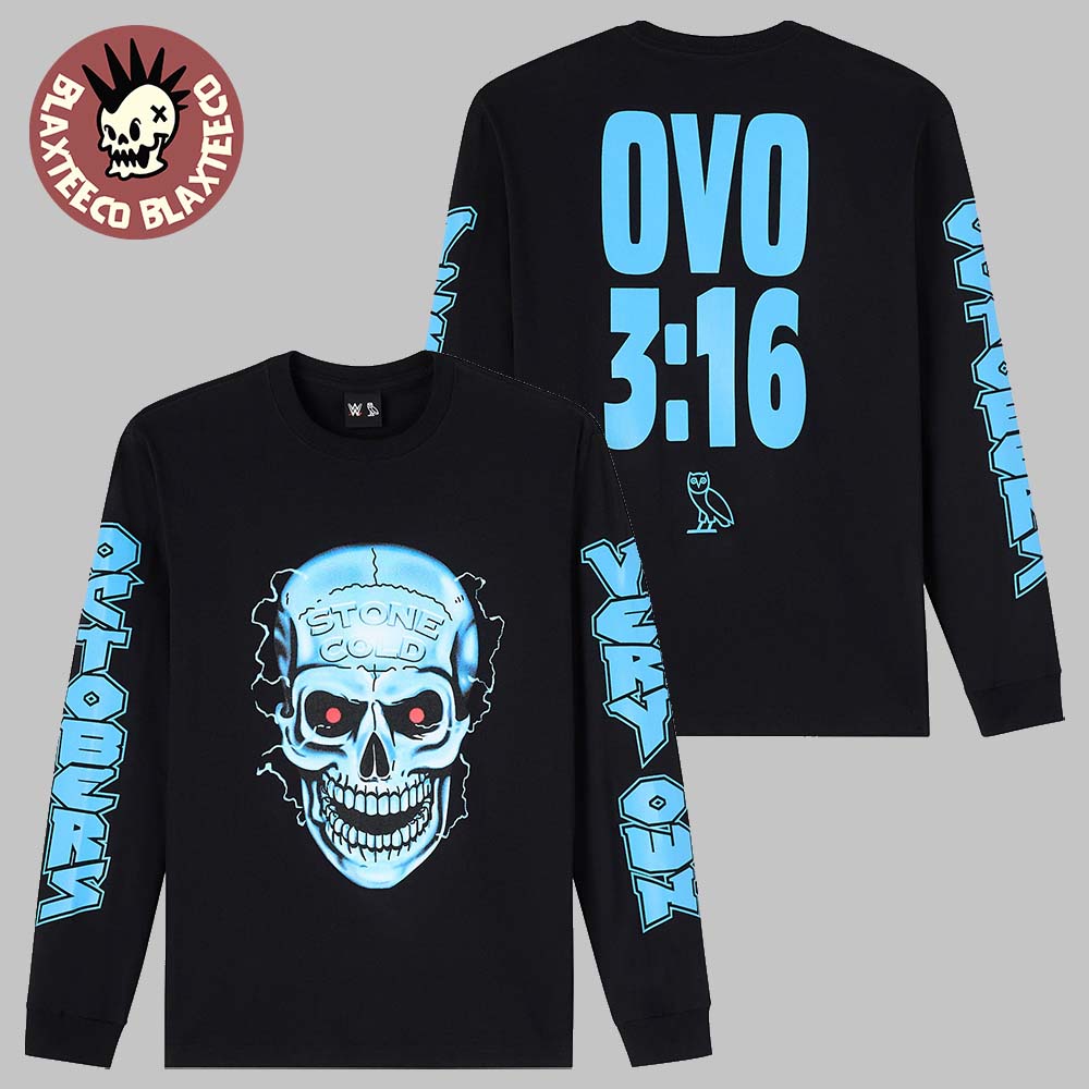 Bring legendary attitude to your wardrobe with the OVO X WWE Wrestlemania 42 Las Vegas Celebration Stone Cold Steve Austin 3 16 Long Sleeve Tee. This standout piece merges the rebellious energy of Stone Cold Steve Austin with Drake’s iconic OVO streetwear aesthetic. The front features a bold skull graphic with “Stone Cold” detailing, delivering that unmistakable WWE edge, while the back showcases the striking “OVO 3:16” print in vibrant blue. Sleeve graphics add an extra layer of attitude, making this long sleeve tee a true statement piece inspired by one of wrestling’s most iconic catchphrases and moments.