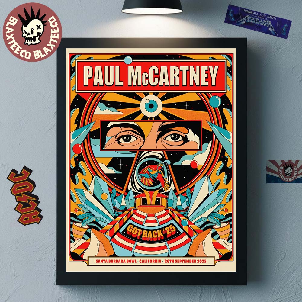 Celebrate an unforgettable night of music history with the Paul McCartney Got Back 25 Tour Santa Barbara Bowl California Gig Poster On September 26 2025 Home Decor Poster Canvas. Designed with a bold and psychedelic aesthetic, this collectible poster captures the legendary spirit of Paul McCartney’s live performance at one of California’s most iconic venues. The striking artwork features vibrant colors, abstract cosmic elements, and McCartney’s iconic eyes, making it more than just a poster—it’s a piece of art that reflects the timeless energy of his music. Whether you were part of the audience at the Santa Barbara Bowl or simply a devoted fan, this poster is the perfect way to relive the magic of the Got Back 25 Tour.