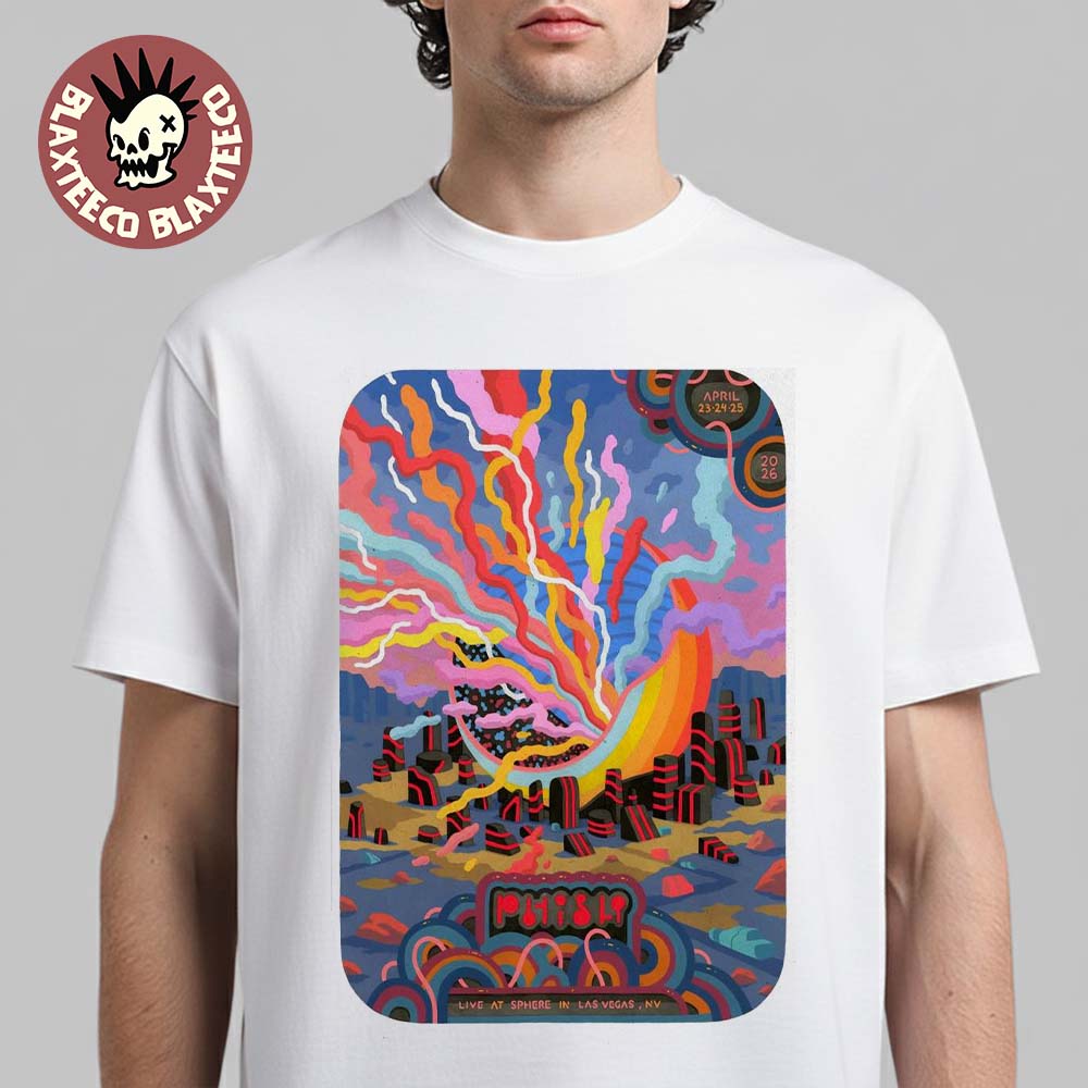 The Phish Live At Sphere Las Vegas 2026 Final Weekend 2 LE Gig Poster For April 23 24 And 25 2026 T-Shirt is a vibrant and collectible piece that captures the electrifying spirit of Phish’s legendary Sphere residency. Featuring a bold, psychedelic design filled with colorful flowing shapes, abstract cityscapes, and surreal energy bursts, this artwork reflects the band’s signature improvisational style and immersive live experience. The graphic commemorates the highly anticipated final weekend shows on April 23, 24, and 25, 2026, making it a meaningful keepsake for fans who followed or attended this unforgettable run in Las Vegas. With its Limited Edition (LE) gig poster-inspired print, this T-shirt stands out as both wearable art and a tribute to one of Phish’s most iconic performances.