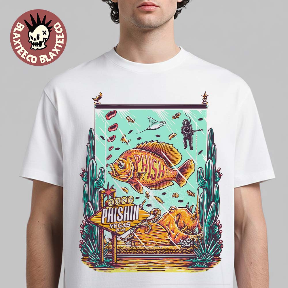The Phish Live At Sphere Las Vegas 2026 Venue Poster T-Shirt is a vibrant and artistic piece that transforms iconic concert poster design into wearable fan merch. Made from high-quality, soft cotton, this white t-shirt offers superior comfort, breathability, and durability, making it perfect for everyday wear or music events. The front features a colorful, surreal illustration inspired by the official Vegas 2026 venue artwork, showcasing a bold “PHISH” fish centerpiece surrounded by desert elements, floating objects, and playful details. The “Gone Phishin’ Vegas 2026” theme adds a fun and memorable touch, perfectly capturing the band’s creative and improvisational spirit.