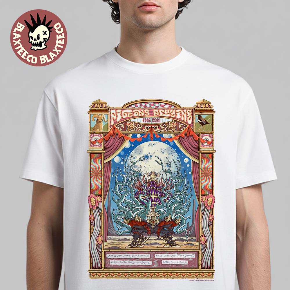 Step into a world of vibrant sound and psychedelic artistry with the Pigeons Playing Ping Pong Colorado 2026 Run Shows City Dates Poster T-Shirt, a standout piece for fans of funk, jam, and live music culture. Inspired by the band’s highly anticipated Colorado 2026 tour, this shirt features a mesmerizing, poster-style design that blends surreal imagery with intricate details and bold colors. The artwork showcases a mystical stage framed by ornate patterns, cosmic elements, and a striking central figure, capturing the free-spirited energy that defines Pigeons Playing Ping Pong. Printed on high-quality fabric, this t-shirt delivers both comfort and durability, making it perfect for concerts, festivals, or everyday wear.