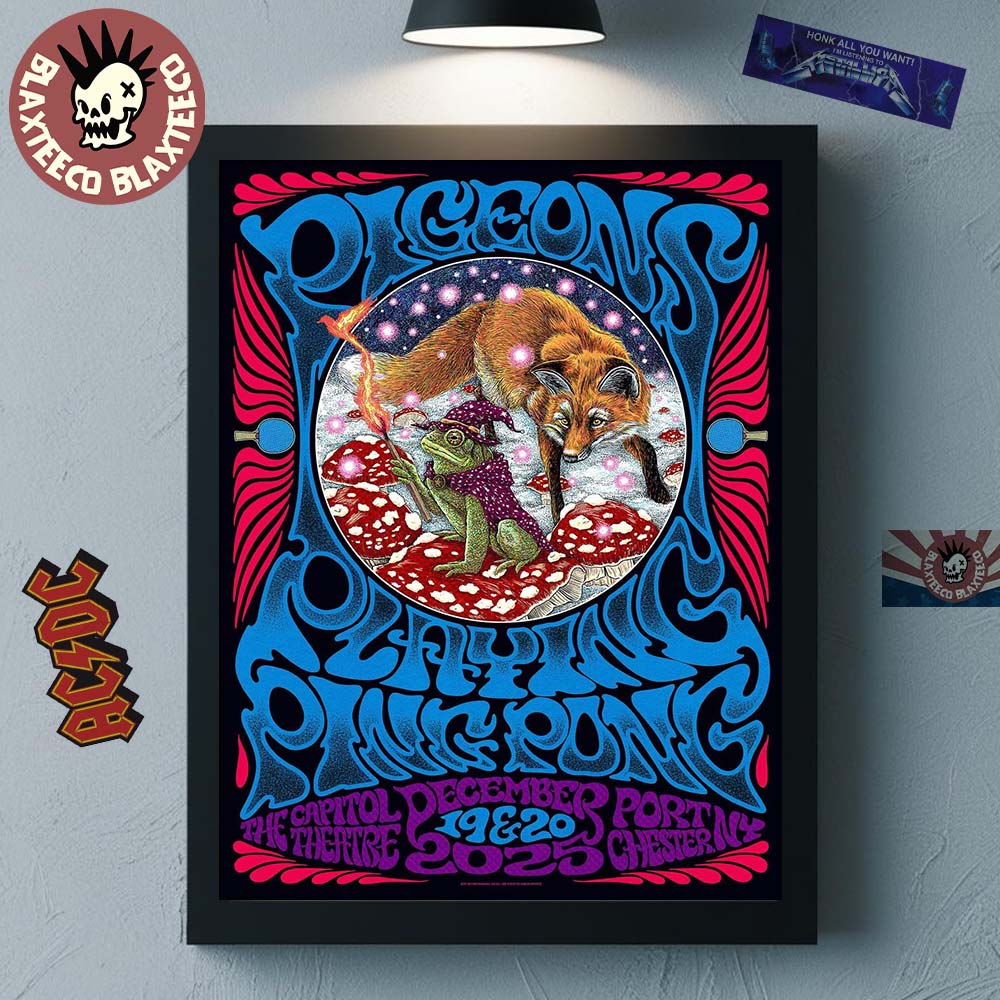 Pigeons Playing Ping Pong Port Chester New York 2025 Venue Poster On December 19 And 20 2025 At The Capitol Theatre The Wizard Frog And The Fox Art Poster Canvas is a stunning piece of psychedelic concert art inspired by the band’s unforgettable performances at The Capitol Theatre on December 19 and 20, 2025. Featuring the imaginative “Wizard Frog and the Fox” artwork, this poster blends whimsical fantasy with bold, retro-inspired typography that perfectly captures the playful funk energy of Pigeons Playing Ping Pong. The vivid colors, surreal characters, and intricate details make this design stand out as a true visual representation of the band’s creative spirit and jam-band culture. It’s not just a poster—it’s a piece of storytelling art tied to a memorable live music experience.