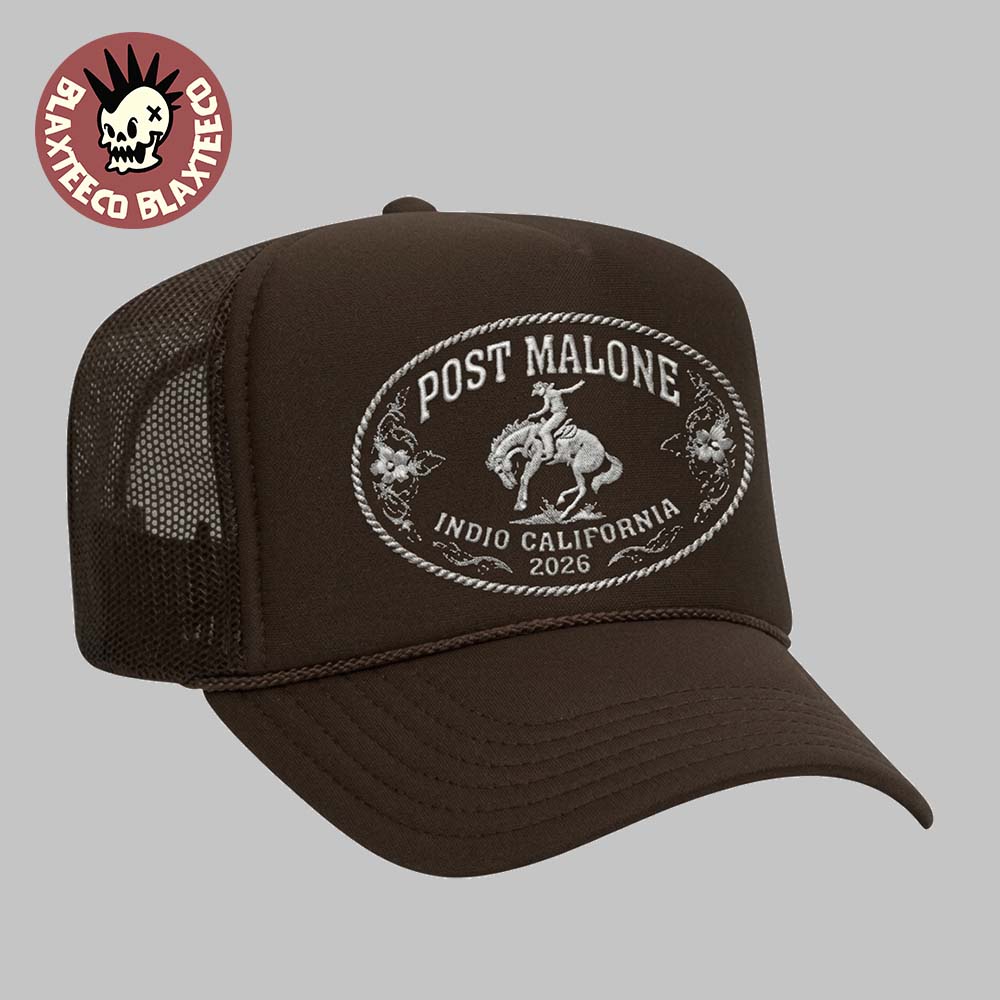 The Post Malone Stagecoach 2026 Festival Indio California Merch On April 26 2026 Brown Trucker Hat is a stylish and rugged accessory that perfectly captures the spirit of country music and festival culture. Designed to commemorate Post Malone’s performance at Stagecoach 2026 on April 26 in Indio, California, this hat features a bold embroidered patch on the front with a classic Western rodeo motif. The oval badge design includes “Post Malone” and “Indio California 2026,” giving it an authentic, vintage belt-buckle-inspired look. The rich brown color enhances its rustic appeal, making it a versatile piece that pairs effortlessly with casual or Western-inspired outfits.