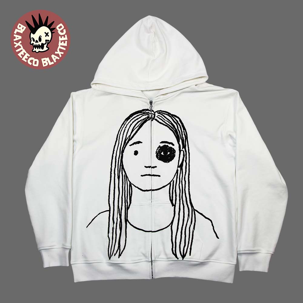 Praiseche Rest In Bass Madonna Zipper Hoodie is a unique and thought-provoking piece of alternative fashion that blends minimalist art with deep emotional symbolism. Featuring a striking black line illustration on a clean white zip-up hoodie, this design presents a haunting, hand-drawn portrait that immediately captures attention. The asymmetrical eye detail and raw sketch style create a powerful visual statement, making this hoodie stand out from typical streetwear. Its understated yet artistic aesthetic is perfect for fans of underground music culture, experimental art, and expressive fashion that tells a story rather than follows trends.