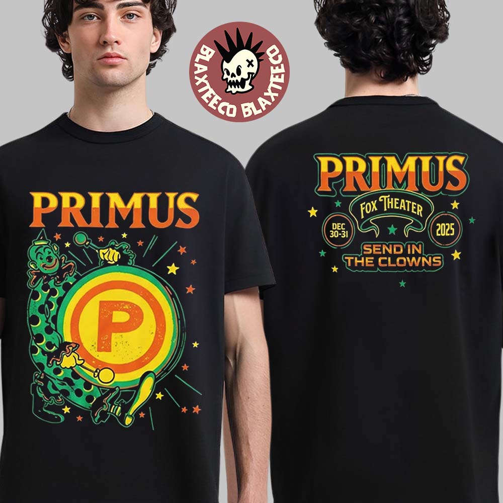 Primus 2025 New Years Eve Shows Merch Tee In Oakland California At December 30 And 31 2025 Send In The Clowns Drummer Clown T-Shirt is a standout piece of official-style concert apparel inspired by the legendary alternative rock band Primus. Featuring bold front-and-back graphics, the design highlights a playful yet eccentric drummer clown illustration paired with vibrant retro colors and classic typography. The front artwork delivers an eye-catching visual punch, while the back design commemorates the special New Year’s Eve run with event details and thematic flair. Printed on a premium black T-shirt, this merch tee perfectly captures Primus’ offbeat humor, experimental spirit, and unmistakable visual identity.