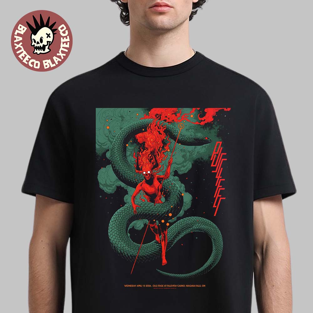 The Puscifer Niagara Falls Ontario Canada 2026 Gig Poster At OLG Stage At Fallsview Casino On April 15 2026 T-Shirt features a mesmerizing and surreal design that perfectly reflects the band’s signature artistic style. Showcasing a vivid illustration of a fiery, otherworldly figure entwined with a massive serpent, this graphic blends dark fantasy with psychedelic elements to create a visually striking composition. The bold contrast of red flames against deep green and black tones adds intensity and depth, while the intricate details capture the experimental and avant-garde essence of Puscifer. Inspired by the Niagara Falls 2026 performance, this design is both a tribute to the live show and a piece of wearable art for true fans.