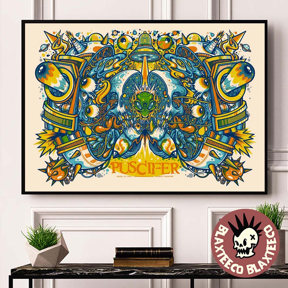 The Puscifer Normal Isn't Tour At Indianapolis Murat Theatre On April 23 2026 Hoem Decor Poster Canvas is a bold and electrifying piece of collectible artwork that perfectly captures the band’s signature fusion of surrealism, satire, and sonic experimentation. This visually explosive design features a symmetrical, psychedelic composition filled with vibrant colors, alien-like figures, mechanical elements, and intricate patterns that draw the eye from every angle. At the center, a striking green creature anchors the artwork, surrounded by dynamic shapes and cosmic motifs that reflect Puscifer’s unconventional style and boundary-pushing creativity. The vivid palette of blues, oranges, and yellows creates a high-energy aesthetic, making this poster a standout tribute to an unforgettable live performance at the iconic Murat Theatre in Indianapolis.