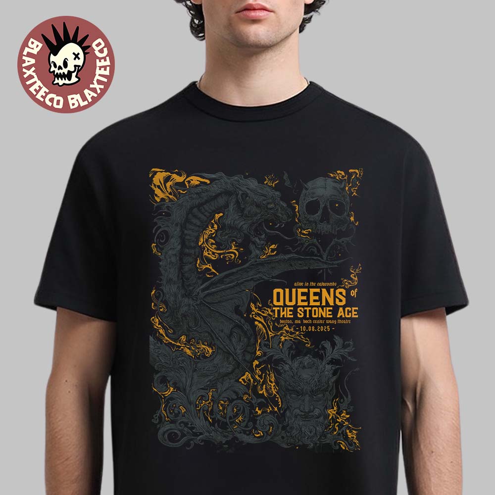 Blaxteeco: About Queens Of The Stone Age Boston Massachusetts 2025 Venue Poster At Boch Center Wang Theatre On October 8 2025 Alive In The Catacombs Unisex T-Shirt: