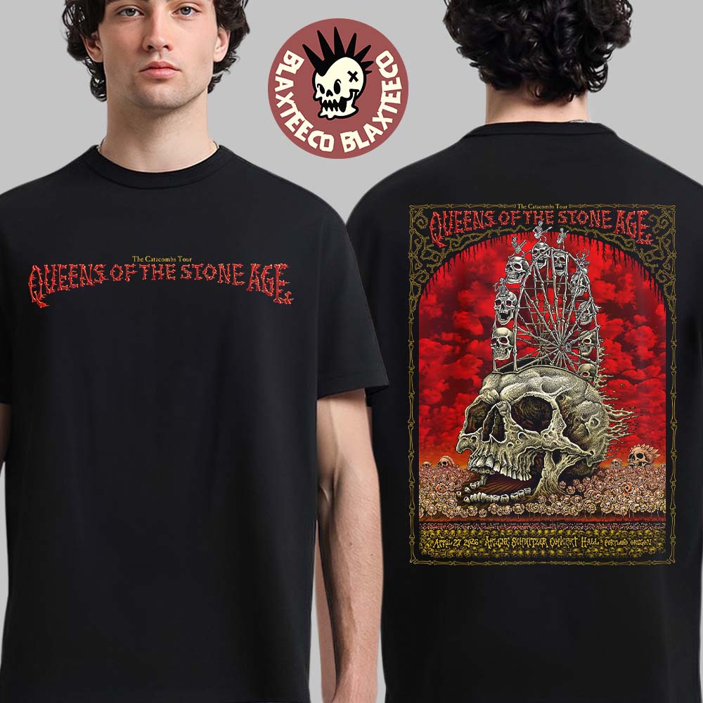 Unleash bold rock energy with the Queens Of The Stone Age Portland Oregon 2026 Venue Poster At Arlene Schnitzer Concert Hall On April 27 2026 Skulls Wheel Art T-Shirt, a must-have piece inspired by the unforgettable April 27, 2026 performance at Arlene Schnitzer Concert Hall. This striking black tee features a clean front design with “Queens Of The Stone Age – The Catacombs Tour” text, giving it a sleek and wearable everyday look. On the back, the shirt comes alive with an intricate skull and ferris wheel artwork set against a vivid red sky, capturing the band’s signature dark, psychedelic aesthetic. It’s the perfect blend of music culture and artistic expression for fans who want to stand out.