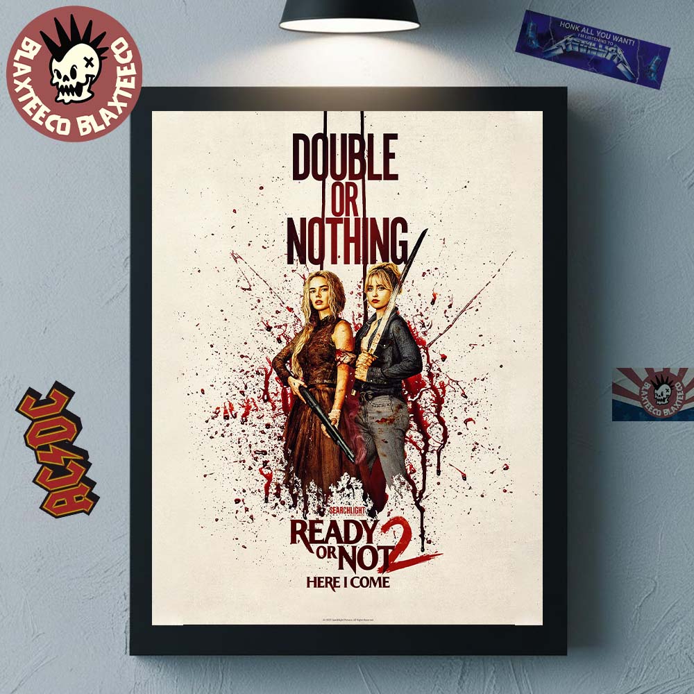Bring thrilling horror-comedy energy into your space with the Ready Or Not 2 Here I Come Official Poster Double Or Nothing Home Decor Poster Canvas. Inspired by the highly anticipated sequel Ready or Not 2: Here I Come, this striking poster captures the intense and stylish tone that fans loved from the original film. The artwork features two fierce characters standing back-to-back with weapons in hand, surrounded by dramatic splashes of red that symbolize the chaos and dark humor at the heart of the story.