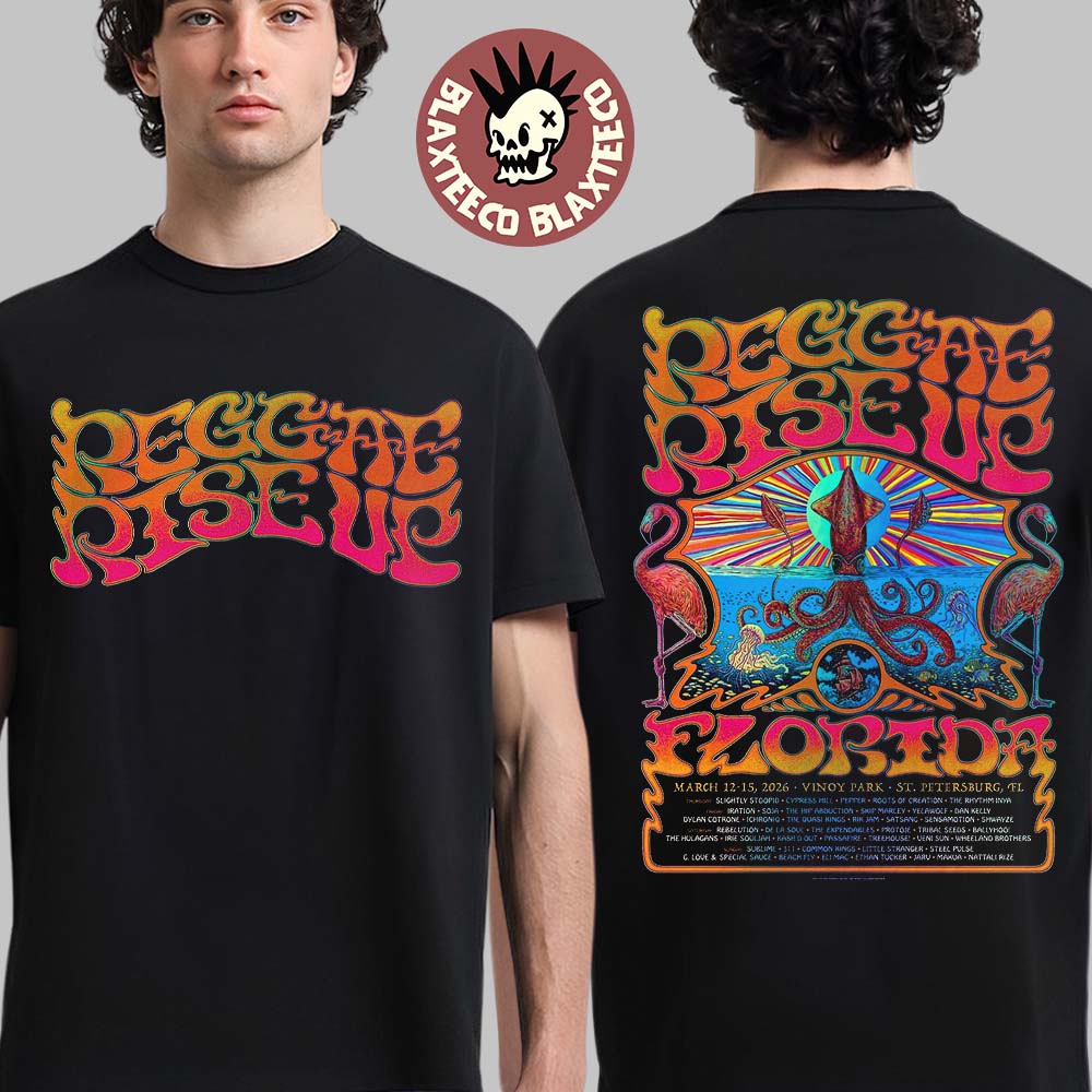 Reggae Rise Up Florida Festival 2026 Official Venue Poster At Vinoy Park In St Petersburg Florida On March 12-25 2026 Two Sided T-Shirt is a vibrant piece of festival merchandise celebrating one of the most beloved reggae events in the United States. The front of the shirt features the colorful Reggae Rise Up logo in bold psychedelic lettering, while the back displays the full festival poster artwork filled with tropical imagery, ocean themes, and radiant sunset colors. The design highlights flamingos, sea life, and a striking octopus illustration, capturing the laid-back coastal vibe that defines the festival experience.