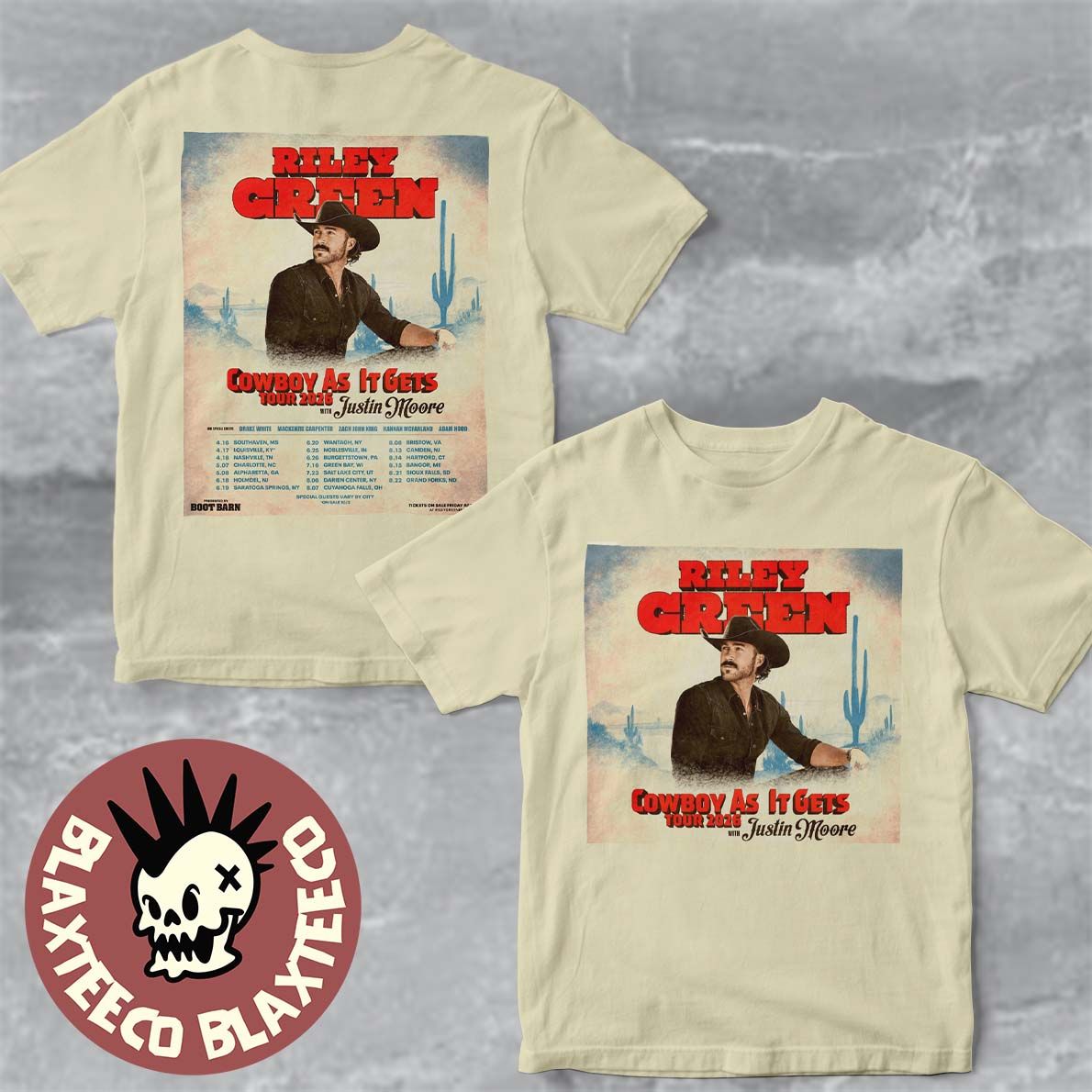 Blaxteeco: About Riley Green Cowboy As It Gets Tour 2026 With Justin Moore North America Schedule Dates Two Sided T-Shirt: