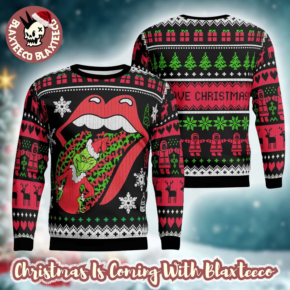 Blaxteeco: About Rolling Stones Big Logo With Grinch Stole The Tongue Funny Ugly Christmas Sweater:
