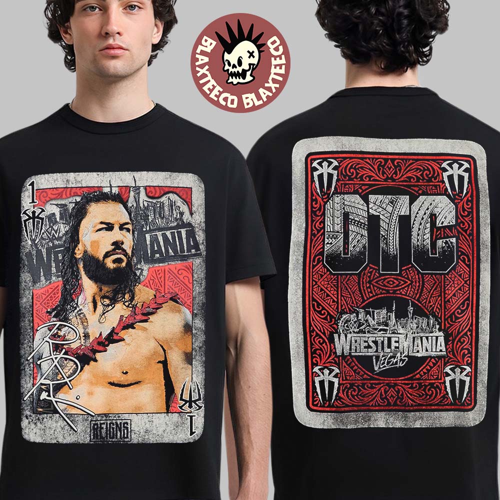 On the back, the design transforms into a dramatic WrestleMania 42 Las Vegas themed playing card layout, featuring intricate patterns, sharp typography, and the iconic “OTC” detail that symbolizes Roman Reigns’ legacy. The two-sided print adds depth and uniqueness, ensuring you stand out from every angle. Whether you’re a longtime supporter or a collector of WWE merchandise, this shirt is a must-have addition to your wardrobe. Pair it effortlessly with casual outfits to showcase your loyalty and style while celebrating one of the most dominant champions in WWE history.
