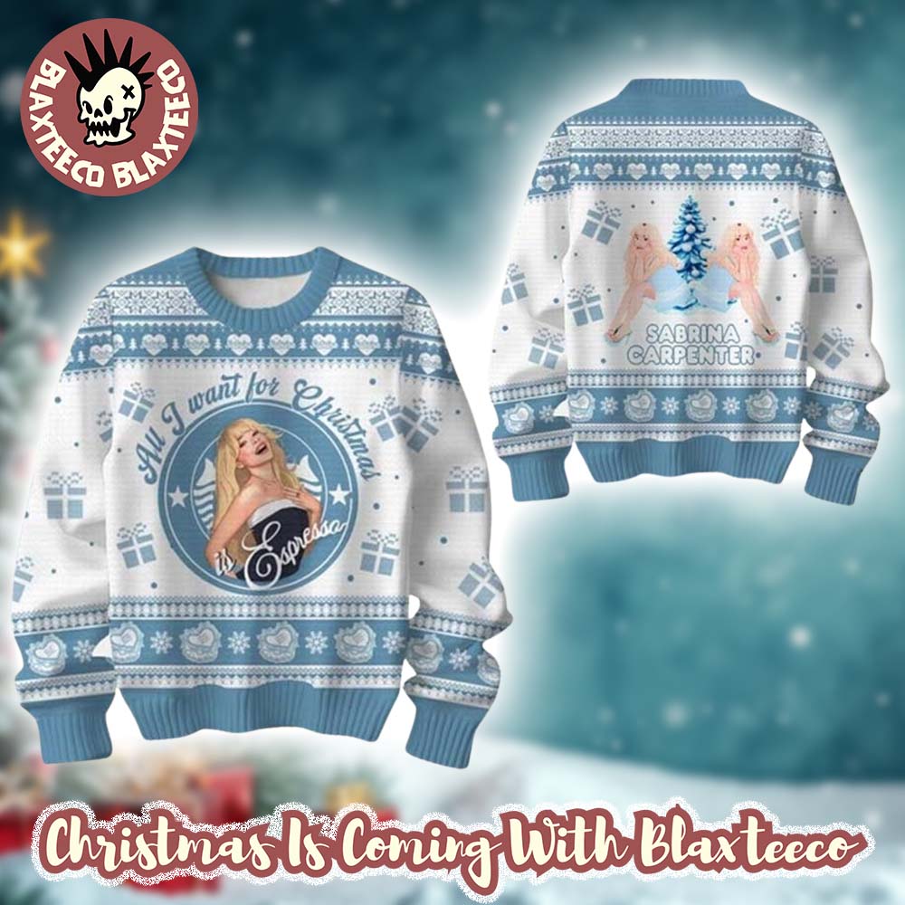 Sabrina Carpenter All I Want For Christmas Is Espresso Gift For Fans Ugly Christmas Sweater is the perfect way to show off your holiday spirit with a dash of caffeine-loving humor. Inspired by Sabrina Carpenter’s playful personality and her viral Espresso hit, this festive sweater blends cozy warmth with a touch of pop-culture charm. The soft blue and white winter tones create a cheerful seasonal look, featuring adorable holiday motifs like snowflakes, presents, and a stunning portrait of Sabrina at the center. Made from premium knit material, this sweater ensures comfort and durability — ideal for chilly winter nights, Christmas gatherings, or coffee dates with friends.