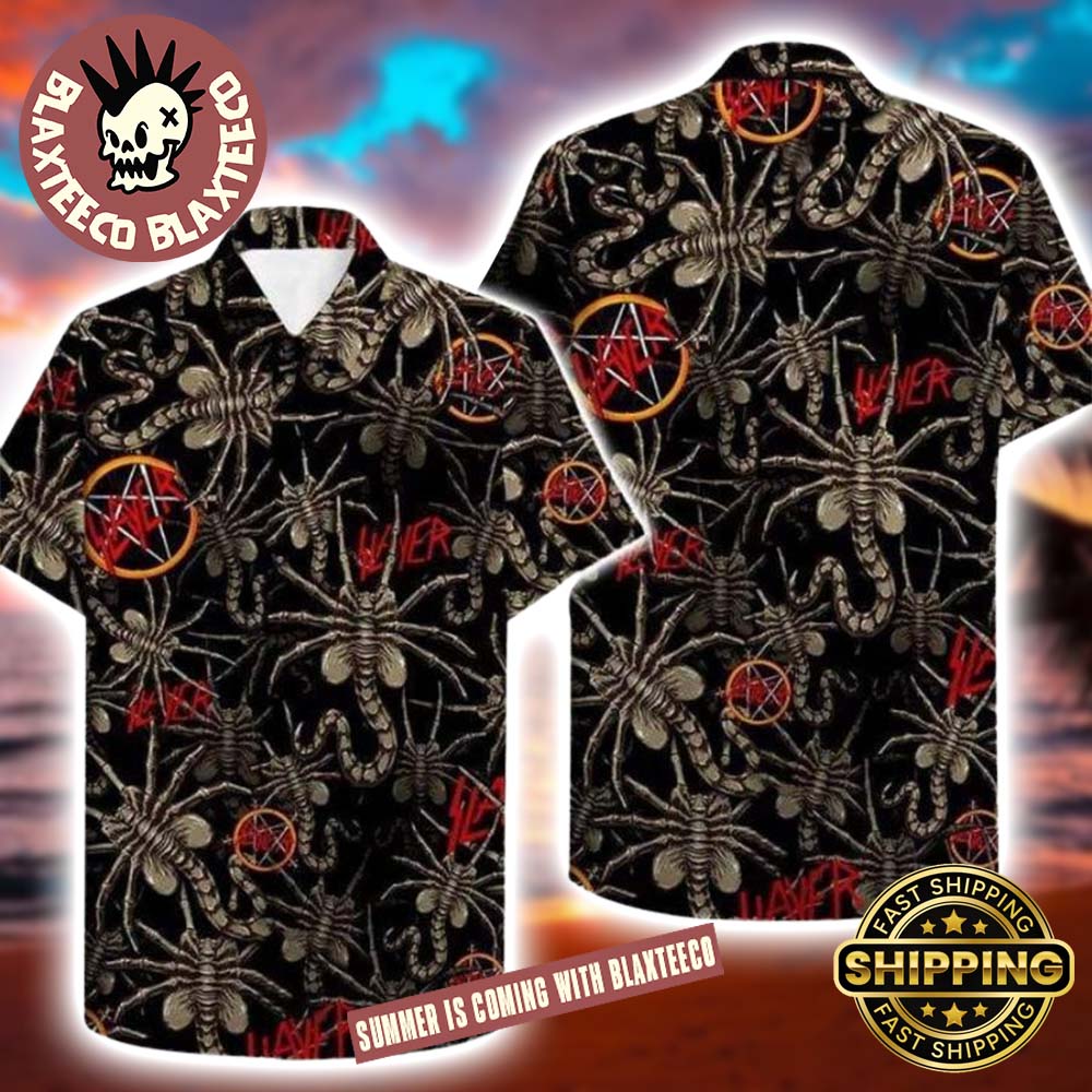 Blaxteeco: About Slayer Band Xenomorp Alien Face And Logo Pattern 2025 Summer Hawaiian Shirt Introduction: