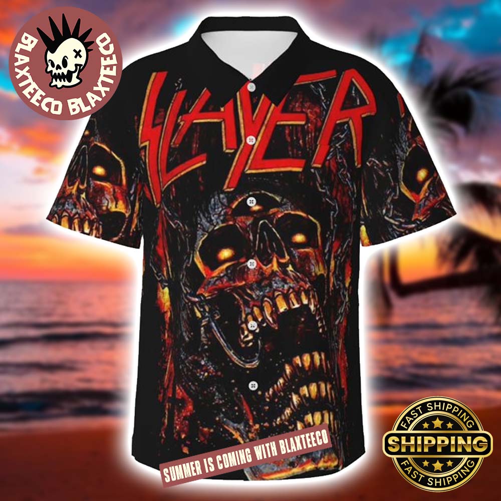 Elevate your summer wardrobe with the Slayer Horror Skull In Flame Gift For Fans 2025 Summer Hawaiian Shirt, a bold and edgy statement piece perfect for die-hard metal fans and summer enthusiasts alike. Featuring a striking horror-themed skull engulfed in fiery flames, this Hawaiian shirt captures the essence of Slayer’s iconic imagery while blending it seamlessly with a vibrant tropical design. Made from lightweight, breathable fabric, it ensures all-day comfort whether you’re at a festival, a beach party, or simply showing off your fan pride. The vivid colors and intricate details make this shirt a must-have collector’s item and a standout addition to any Slayer fan’s summer attire.