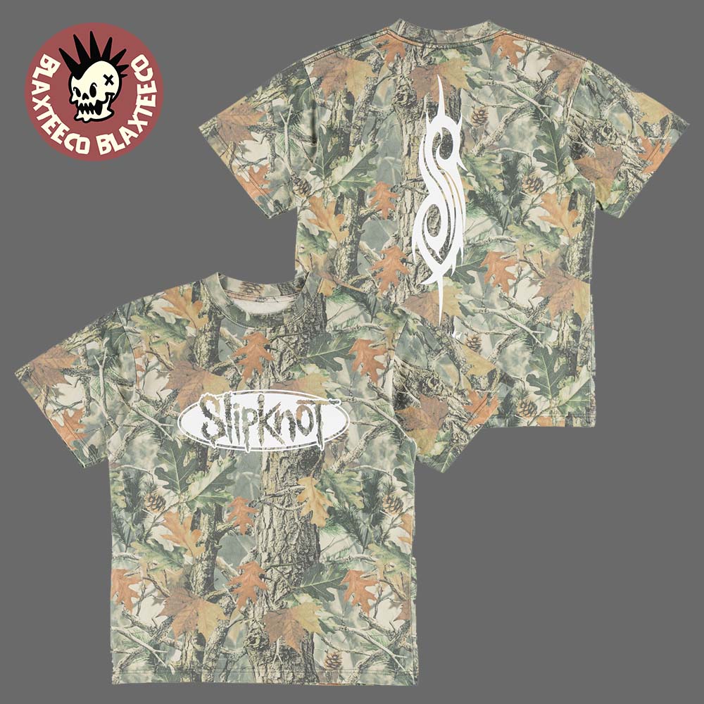 Blend stealth, streetwear, and metal attitude with the Slipknot X Welcome Skateboard Logo Tribal S Camo T-Shirt, a collaboration that fuses Slipknot’s iconic imagery with Welcome’s gritty skate aesthetic. Set against a full Realtree-style camouflage backdrop, this tee brings a rugged outdoor vibe while still delivering the raw energy Slipknot fans love. The front features the distressed Slipknot logo printed inside an oval frame, standing out in bold white against the woodland pattern. The contrast creates a striking visual impact that highlights both the band’s signature style and the rebellious spirit of the skate scene.