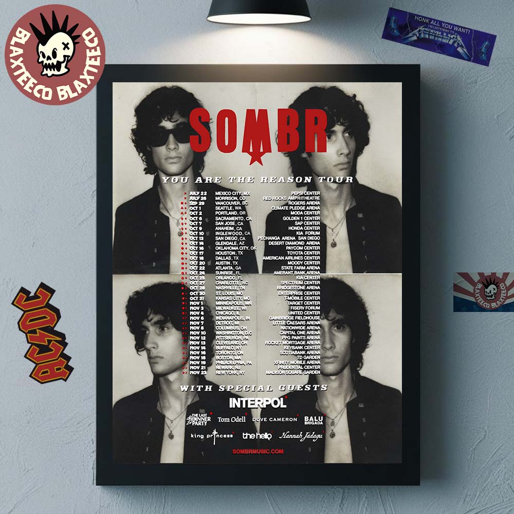 Celebrate modern alternative music with the striking Sombr You Are The Reason Tour 2026 North America Schedule Dates Home Decor Poster Canvas, a must-have piece for fans and collectors alike. This visually captivating canvas design features a bold monochrome aesthetic with multiple portrait shots of Sombr, creating a raw and emotional visual identity that perfectly matches the tone of the tour. The standout red “SOMBR” title adds a powerful contrast, instantly drawing attention and giving the poster a contemporary, edgy feel. Complete with detailed North America tour dates and cities, along with special guest appearances like Interpol, this artwork captures the full essence of the 2026 tour experience.