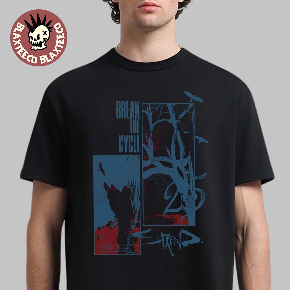 The Staind Break the Cycle 25 Anniversary Peaceful Day T-Shirt is a striking and artistic tribute to one of the most influential alternative rock albums of the 2000s. Featuring a layered, abstract design with moody blue and deep red tones, this shirt captures the emotional depth and introspective themes that define Break the Cycle. The fragmented artwork of bare tree branches, birds in flight, and textured overlays creates a haunting yet calm visual, symbolizing reflection, growth, and the passage of time. Subtle “Break the Cycle” text and the distressed Staind logo add a vintage edge, making this piece feel both nostalgic and modern—perfect for fans who connect with the band’s raw, emotional sound.
