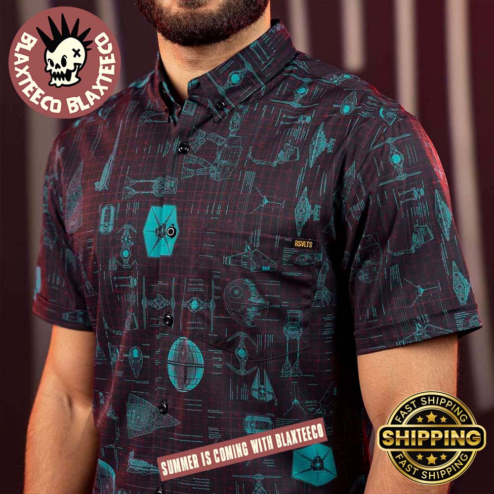 Star Wars RSVLTS Quite Operational Button Short Sleeve Hawaiian Shirt is a clever nod to one of the most memorable lines in Star Wars history, blending Imperial precision with modern summer style. Inspired by technical schematics of iconic Star Wars ships and weapons, this shirt features an intricate blueprint-style print in striking teal lines set against a deep, dark background. The detailed all-over design highlights TIE fighters, the Death Star, and other legendary elements, creating a bold yet sophisticated look for true fans. With its short sleeves and classic button-up construction, this Hawaiian shirt is perfect for warm-weather outings, conventions, or casual everyday wear.