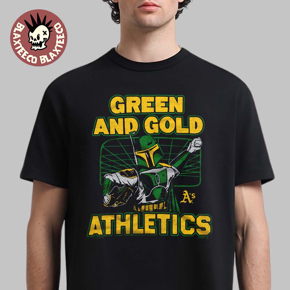 Blaxteeco: About Star Wars X MLB 2026 Star Wars Day Green And Gold Oakland Athletics Dark Side Boba Fett T-Shirt: