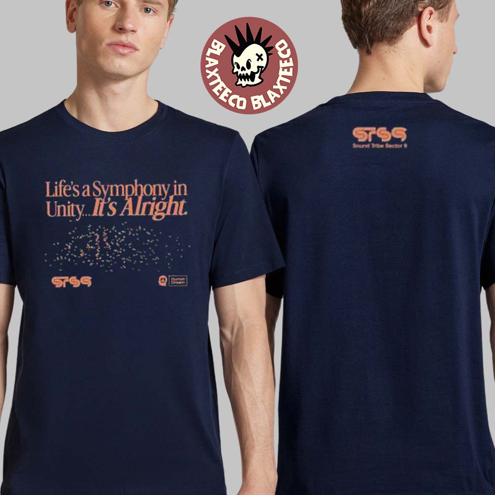 The STS9 Sound Tribe Sector Nine Human Dream Tour 2026 New Orleans And Austin Merch Life's A Symphony T-Shirt is a minimalist yet deeply meaningful piece of merch that captures the essence of the band’s philosophy and sound. Featuring a clean, elegant typographic design across the chest, the shirt highlights the uplifting message “Life’s a Symphony in Unity, It’s Alright,” paired with subtle cosmic-inspired dot patterns that evoke connection, rhythm, and flow. The understated STS9 branding and small tour mark add a refined touch, while the rich navy color gives the shirt a timeless, versatile look that can be worn anywhere. The back keeps it simple with a small STS9 logo, maintaining a sleek and modern aesthetic.