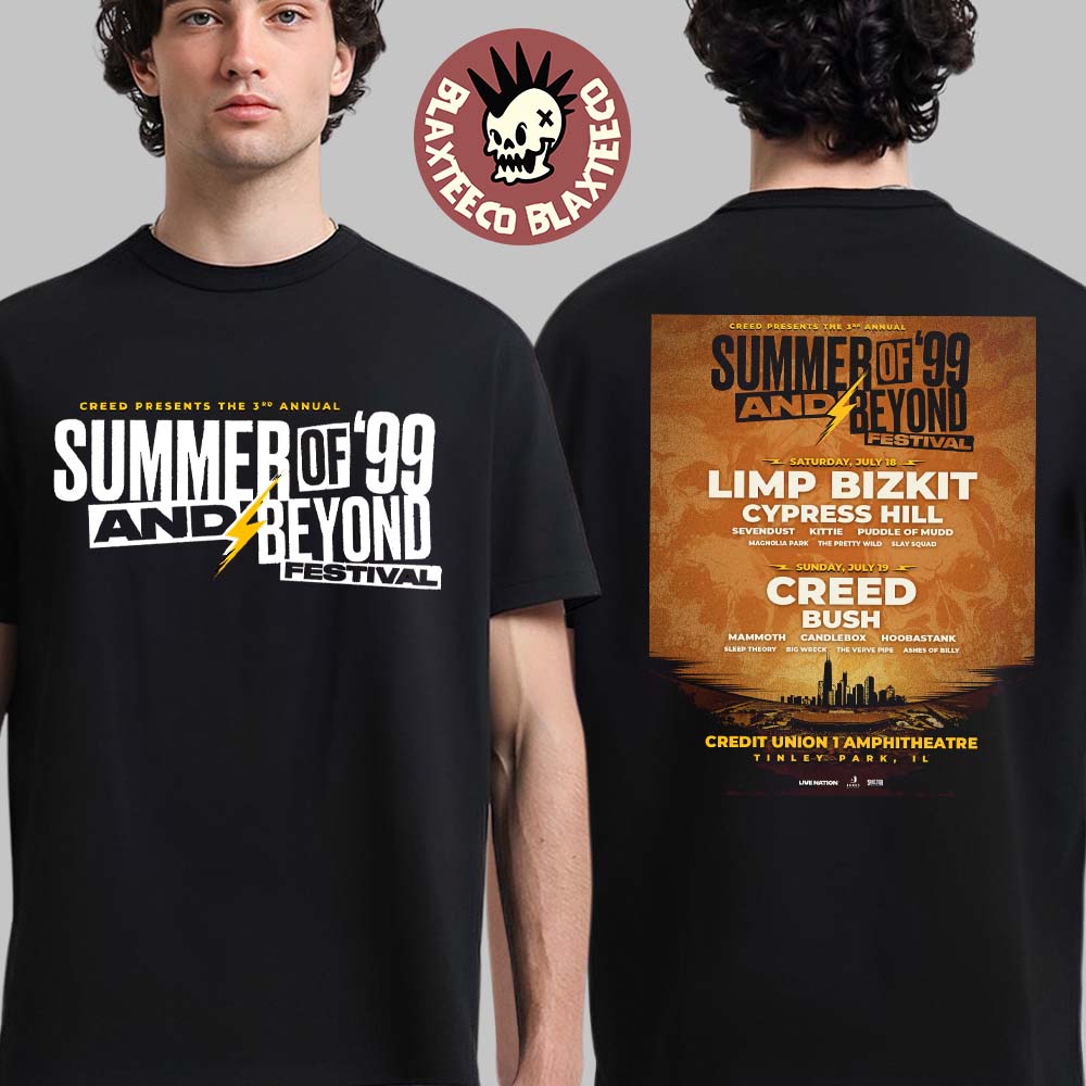 Celebrate the return of iconic rock with the Summer Of '99 And Beyond Festival 2026 Full Lineup In Tinley Park Illinois At Credit Union 1 Amphitheatre Creed Presents The 3rd Annual T-Shirt, presented by Creed for the 3rd annual event. This standout tee features a bold front design with the official festival logo, combining vintage-inspired typography and a lightning bolt graphic that captures the raw energy of late ‘90s rock. On the back, a detailed lineup poster showcases legendary bands like Limp Bizkit, Cypress Hill, Creed, Bush, and more, along with event details at Credit Union 1 Amphitheatre in Tinley Park, Illinois. It’s the perfect way to relive the nostalgia and excitement of this epic two-day festival happening July 18–19, 2026.