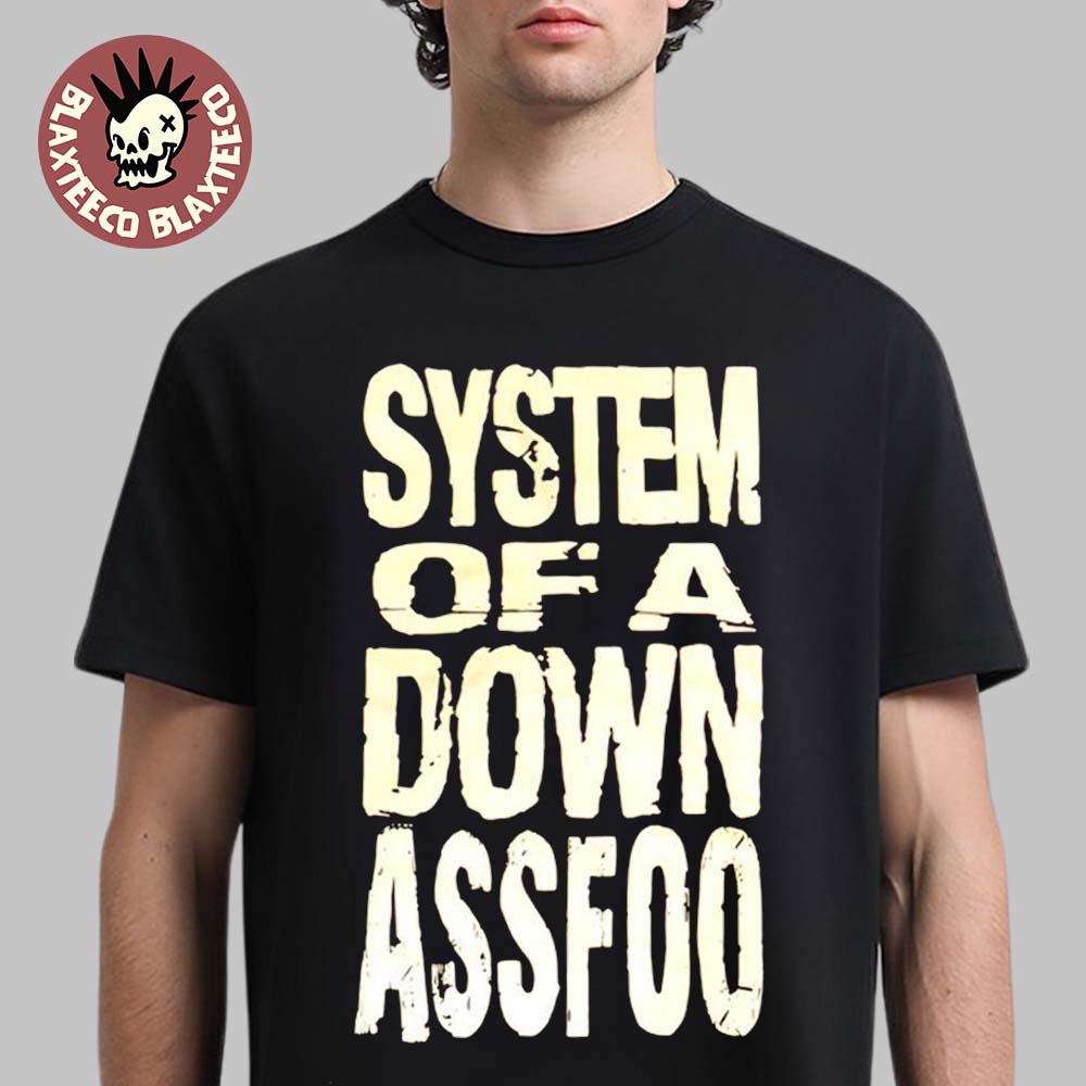 The System Of A Down Ass Foo T-Shirt is a bold and edgy piece designed for fans who appreciate the band’s raw attitude and unapologetic style. Featuring a striking stacked text graphic on the front, this shirt highlights the iconic “System Of A Down” name in a distressed, grunge-inspired font, followed by the rebellious “ASSFOO” statement. The high-contrast design against a classic black background creates a powerful visual impact, making it perfect for concerts, streetwear looks, or anyone wanting to showcase their love for alternative metal culture with confidence and edge.