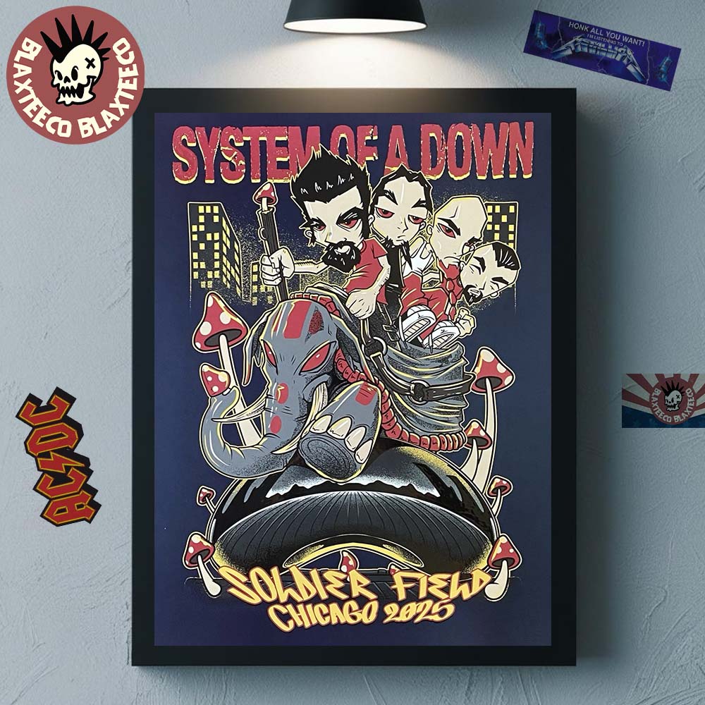 Celebrate the explosive energy of one of rock’s most iconic bands with the System Of A Down Chicago 2025 Venue Poster At Soldier Field On August 31 And September 1 2025 Home Decor Poster Canvas. Designed exclusively for their back-to-back performances at Soldier Field on August 31 and September 1, 2025, this limited-edition home decor canvas captures the raw spirit of the band in a bold and artistic way. The poster features a striking cartoon-style illustration of the band members, set against a dynamic urban backdrop with surreal elements like mushrooms and a powerful elephant, symbolizing the band’s unique fusion of intensity and creativity. The vivid details and rich colors make it a perfect centerpiece for any fan’s collection.