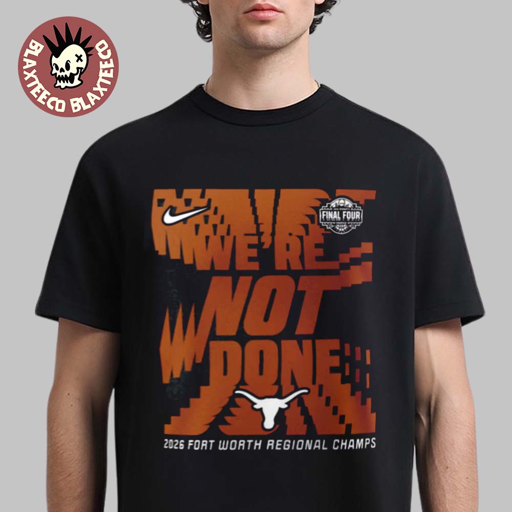Show your pride for a championship-caliber team with the Texas Longhorns Women's Basketball Nike 2026 NCAA Final Four Locker Room T-Shirt, a bold tribute to determination and success. This eye-catching design features the powerful statement “We’re Not Done” in a dynamic, modern font, capturing the relentless spirit of the Longhorns. Accented with the iconic Texas Longhorns logo and 2026 Final Four branding, along with “Fort Worth Regional Champs,” this shirt celebrates a major milestone in the team’s journey. The striking burnt orange graphics stand out against the black background, creating a strong and energetic look perfect for any fan.