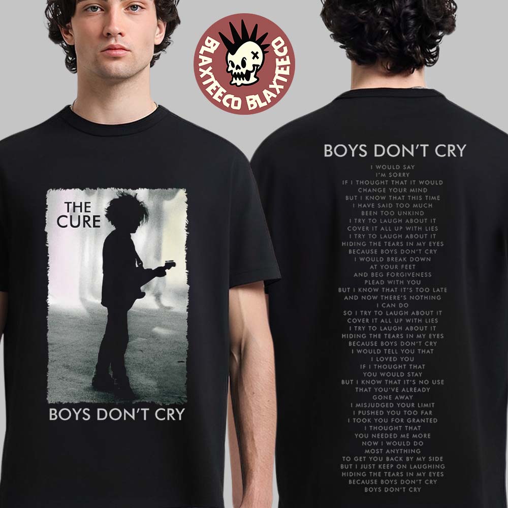 The back design elevates this tee even further, showcasing the full “Boys Don’t Cry” lyrics in a clean vertical layout, turning the shirt into a wearable piece of music history. Printed on high-quality fabric for comfort and durability, this two-sided The Cure T-shirt is perfect for concerts, casual wear, or collectors who appreciate emotionally resonant band merch. Whether you’re a lifelong Cure fan or discovering their legacy, this shirt delivers iconic style, lyrical depth, and timeless alternative spirit in one powerful design.