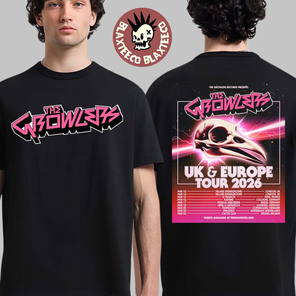 On the front, the shirt features The Growlers logo in a vivid pink-and-white design that pops cleanly against the black fabric—minimal, sharp, and instantly recognizable. The back showcases a full UK & Europe Tour 2026 poster graphic, complete with the striking skull-and-neon lightning artwork and a detailed list of European and UK tour dates and cities, turning the tee into a wearable tour flyer.