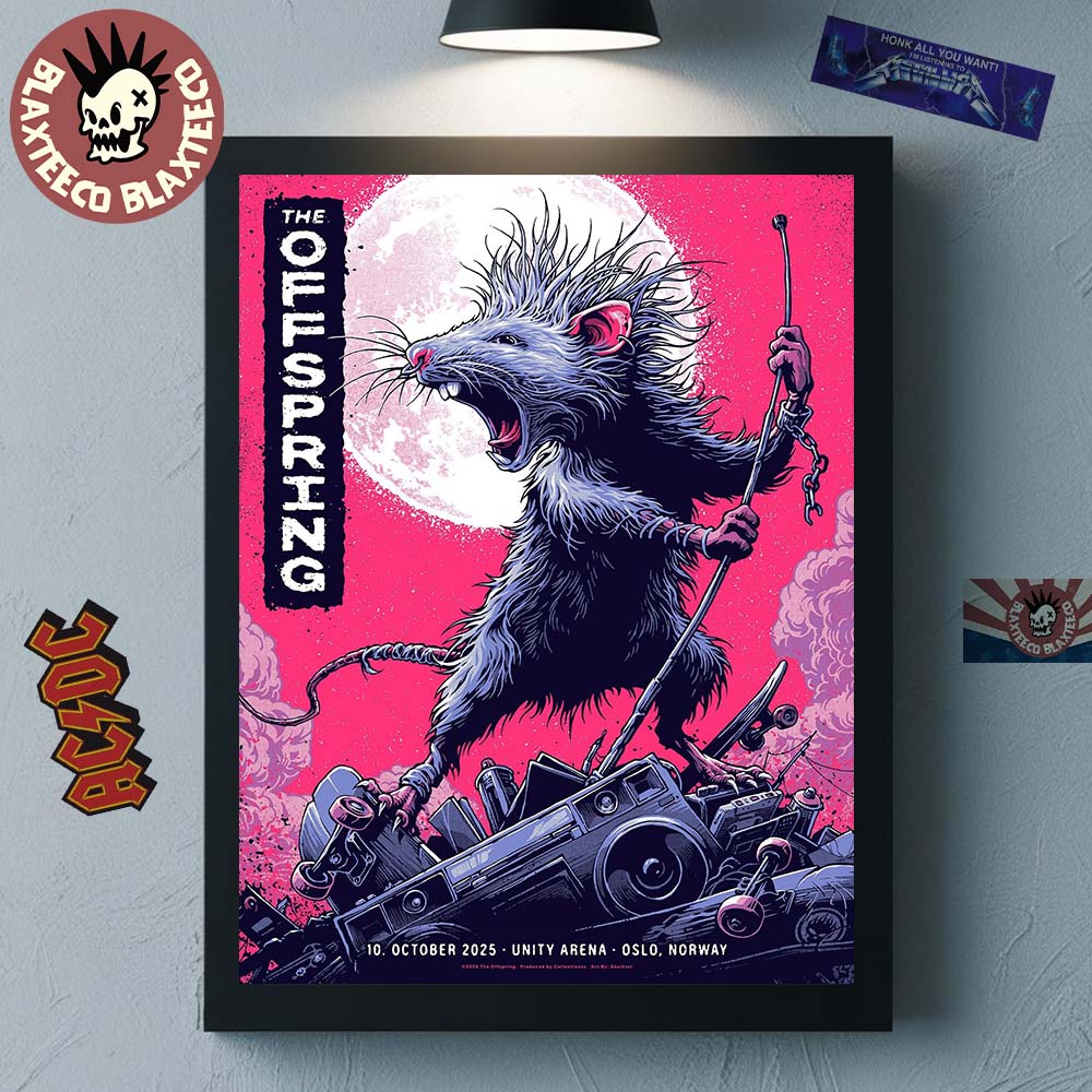 Celebrate punk rock energy and rebellious spirit with this The Offspring Oslo Norway 2025 Concert Poster At Unity Arena On October 10 2025 Home Decor Poster Canvas, featuring artwork inspired by their explosive live show at Unity Arena on October 10, 2025. The design showcases a fierce rat warrior standing atop a pile of amplifiers beneath a blazing full moon — a perfect reflection of The Offspring’s raw attitude and chaotic stage presence. With its striking mix of pink, black, and white tones, this poster captures the adrenaline and edge that fans have come to love from one of punk rock’s most iconic bands.