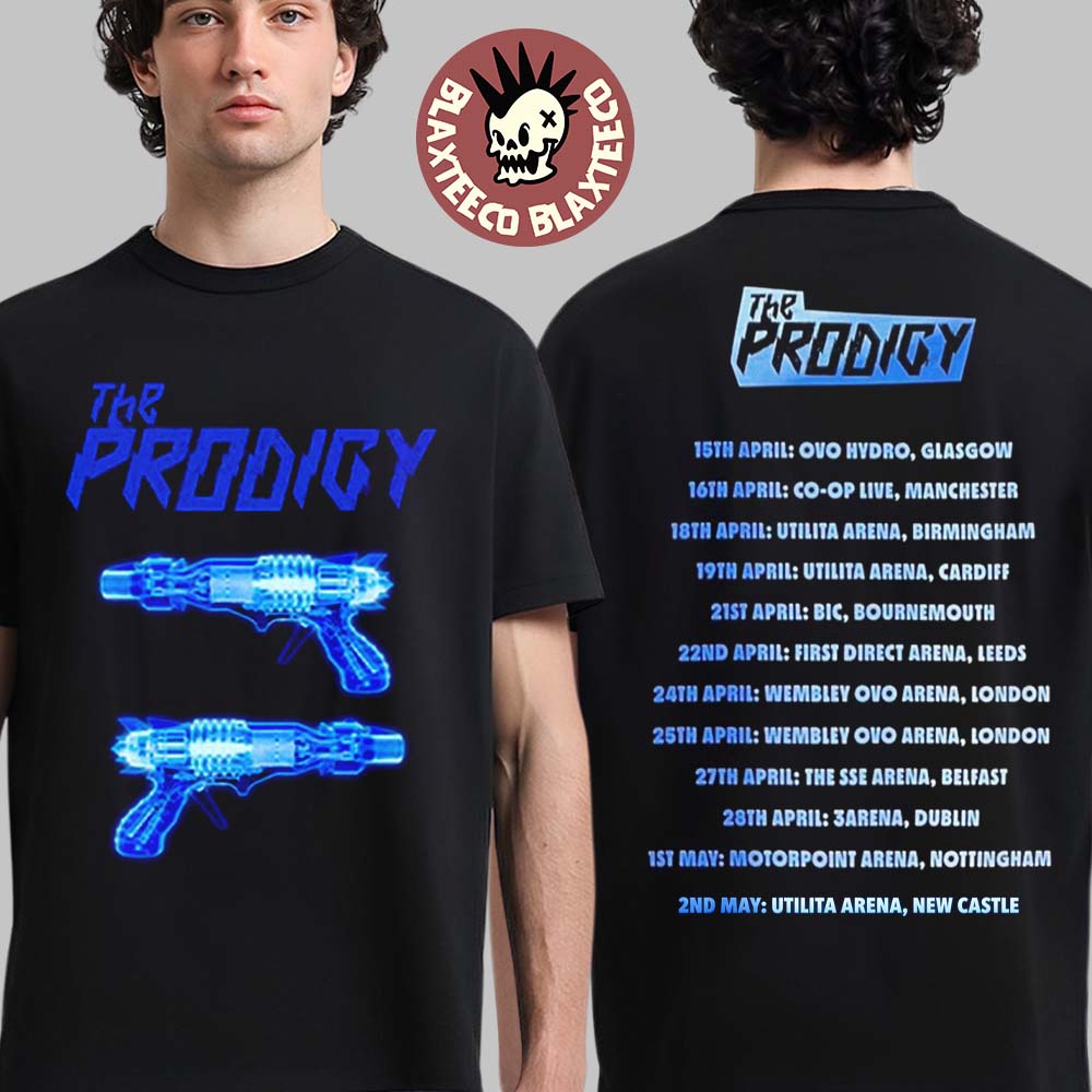 Turn up the energy with The Prodigy Warriors Dance UK And Ireland Arena Tour 2026 Merch The Electric Guns T-Shirt, a bold and electrifying piece that perfectly captures the band’s iconic rave and punk fusion style. This striking black tee features a vivid neon-blue graphic of futuristic electric guns on the front, paired with The Prodigy logo in a glowing, high-voltage design. The intense visual aesthetic reflects the group’s raw sound and rebellious attitude, making it a standout choice for fans who love edgy, statement-making apparel.