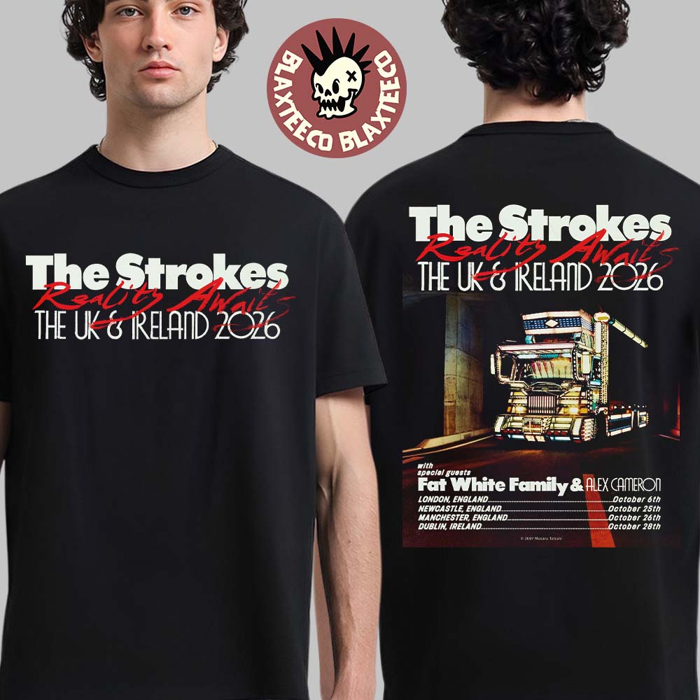 Blaxteeco: About The Strokes Reality Awaits The UK And Ireland 2026 Tour Schedule Dates Two Sided T-Shirt: