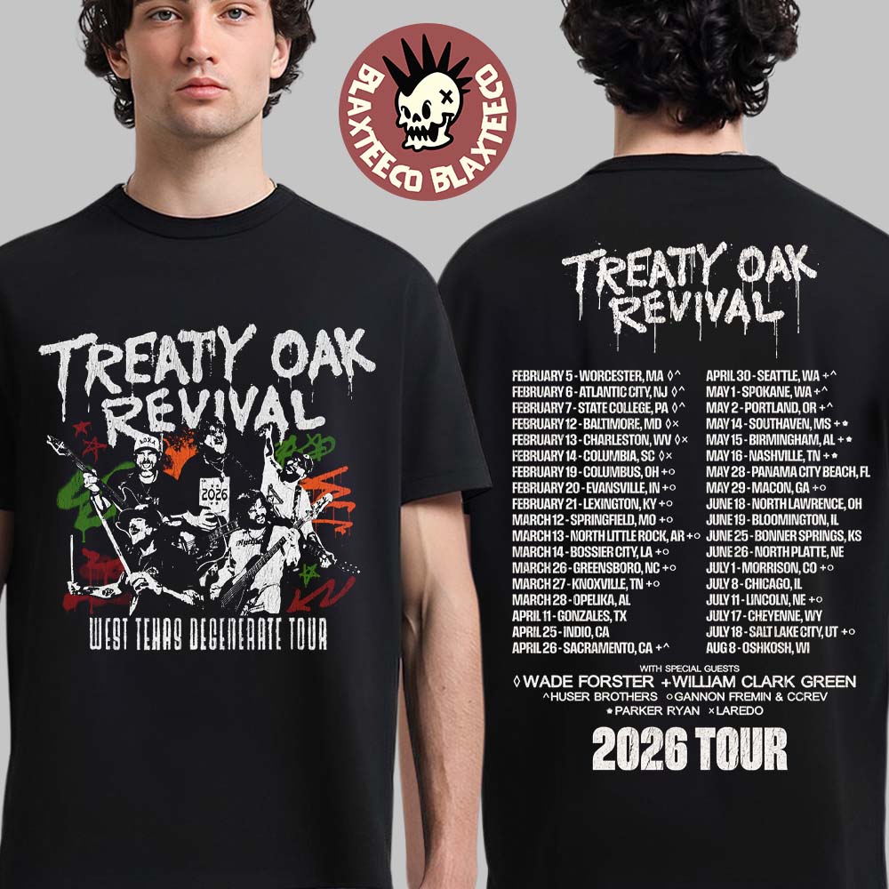 On the back, the shirt highlights the full 2026 tour schedule, listing cities and dates across the United States, along with special guest appearances that made this tour unforgettable. Crafted from soft, durable fabric, this two-sided t-shirt ensures all-day comfort while maintaining vibrant print quality through repeated wear. Whether you caught them live or just love their hard-hitting style, this Treaty Oak Revival tour tee is more than merch—it’s a statement piece that celebrates the spirit of independent music and life on the road.