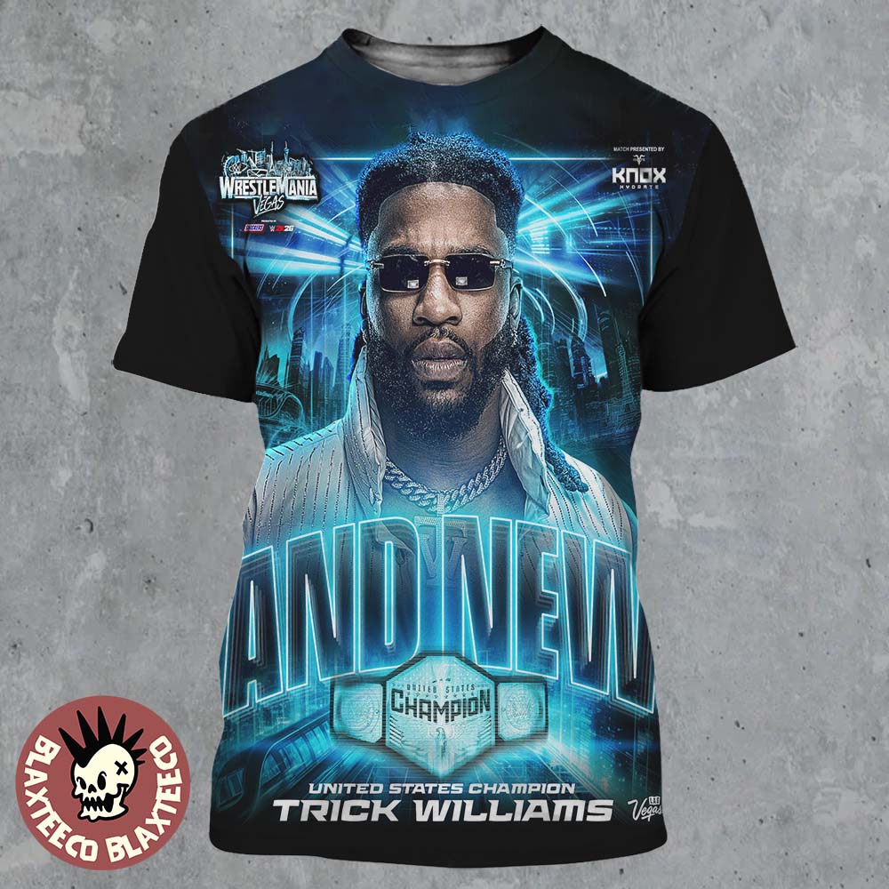 Celebrate the rise of a new champion with this bold Trick Williams And New WWE United States Champion In Wrestlemania 42 Vegas All Over Print Shirt. Featuring a dynamic full-front design, this shirt showcases Trick Williams in a confident, commanding pose, highlighted by the powerful “AND NEW” statement and a glowing United States Championship belt. The futuristic Las Vegas skyline and neon blue lighting effects create an electrifying backdrop that captures the energy of WrestleMania 42. Perfect for WWE fans, this all over print shirt represents a defining moment in Trick Williams’ career and the arrival of a new era in sports entertainment.