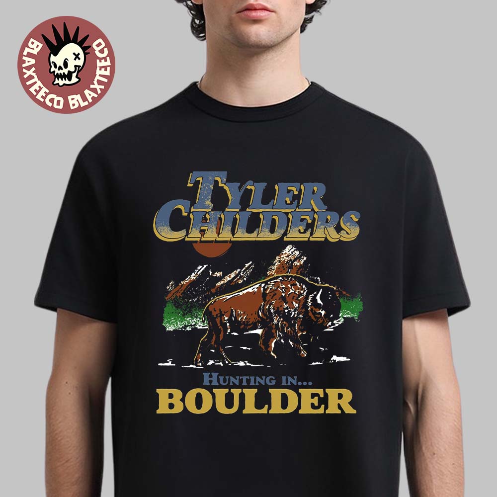 Celebrate authentic country storytelling with the Tyler Childers Snipe Hunt 2026 Tour Merch Hunting In Boulder Colorado At Folsom Field On July 18 2026 T-Shirt. This classic black tee features a bold front graphic with “Tyler Childers” in vintage-style lettering, paired with a rugged outdoor scene showcasing a buffalo against a scenic mountain backdrop. The design captures the spirit of the American West, perfectly reflecting Childers’ roots-driven sound and storytelling style. The earthy tones and retro aesthetic make this shirt a standout piece for fans who appreciate both music and nature-inspired design. Made from soft, high-quality fabric, it offers lasting comfort whether you’re at a concert or out on the town.