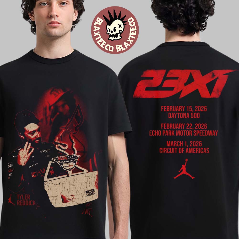 On the back, the shirt showcases a large 23XI Racing logo in bold red lettering, representing the team founded by Michael Jordan and Denny Hamlin. Beneath the logo, the design lists key 2026 NASCAR race events, including the Daytona 500 (February 15, 2026), Echo Park Motor Speedway (February 22, 2026), and Circuit of the Americas (March 1, 2026). The iconic Jordan Brand Jumpman logo adds a unique streetwear influence, blending motorsports culture with legendary athletic branding. Made for both comfort and style, the Tyler Reddick 23XI Racing Promo T-Shirt is perfect for race day, NASCAR events, or everyday wear for fans who want to represent their favorite driver and team.