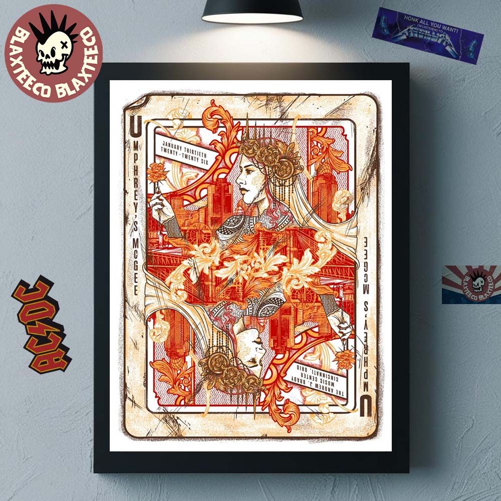 Umphrey's McGee Cincinnati Ohio 2026 Event Poster At Music Center On January 30 2026 Decor Poster Canvas is a beautifully crafted piece of wall art designed to commemorate the band’s live performance at the Andrew J. Brady Music Center on January 30, 2026. Featuring an intricate, vintage-inspired illustration with rich red, orange, and cream tones, this artwork blends ornate linework with symbolic imagery that reflects Umphrey’s McGee’s progressive and improvisational sound. The playing-card–style composition gives the poster a timeless, collectible feel, making it a standout visual tribute to a memorable night of live music in Cincinnati.